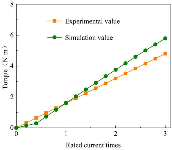 It can be observed from Figure 10 that the output torque of the prototype is directly proportional to the current multiplier within the testing range. This indicates that the motor has a higher potential for overload when the motor temperature restrictions are ignored, or the motor cooling capability is improved. In addition, Figure 10 also provides the corresponding calculated values and a good consistency between the calculated and measured values can be observed through comparison.
