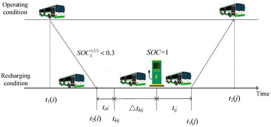 The model takes into account the multi-type EPTVs with different load capacities and battery capacities. Given that maintaining a discharge depth lower than 70–80% can benefit the battery life, it is of significance to control the state of the charge (SOC) of electric vehicles to be above 30%, subject to the battery-allowed mileage. Therefore, when the SOC falls below or equals 30%, the vehicle requires charging. One instance is illustrated in Figure 1. Trip i starts at and ends at , that is, at time , when the SOC is less than 30% and the vehicle starts charging. is the recharging time of vehicle k during the idle time between trip i and trip j.