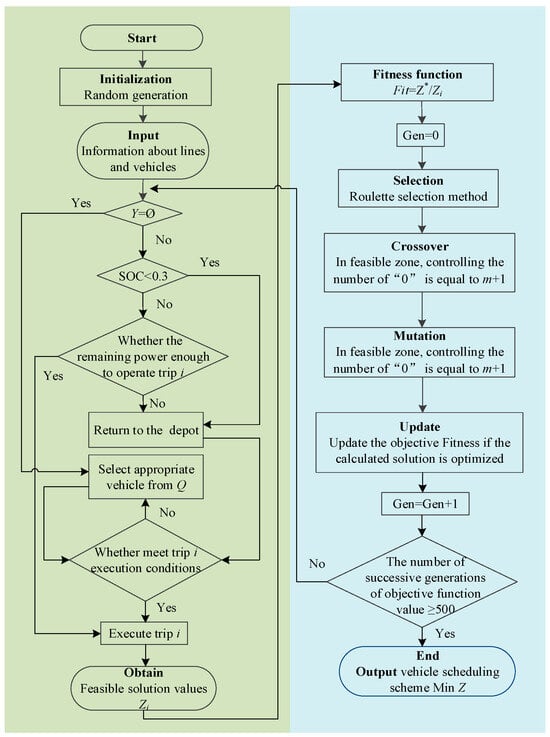 The vehicle scheduling solution can output a series of trip assignments to obtain the trip chain of vehicles. The GA is a population-based optimization search algorithm that uses the survival of the fittest []. To tackle this problem, we employ the GA to encode the execution assignment for each trip. Primarily, we input the relevant information about the routes and vehicles involved, including the line mileage, the number of vehicles, the vehicle idle mileage, and so on. Next, we arrange the trips in ascending order based on their departure times. The steps involved with GA are exhibited below, as follows: