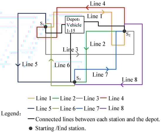 where 0 denotes the depot and represents vehicle k operating for trip j. The following vector (0, 1, 5, 7, 0, 4, 8, 0, 2, 3, 0, 6, 0, 0) represents the vehicle scheduling scheme, which means that there are eight service trips to execute overall, and the fleet size in the depot is five: