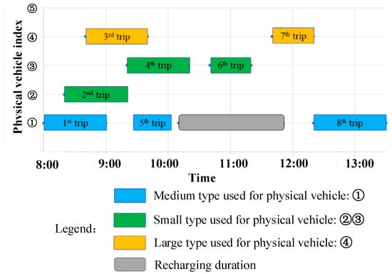 In terms of the multi-type EVS constraints, the idle mileage, charging time, trip connections, and passenger constraints are taken into consideration. In order to cover all trips, Equations (5) and (6) show that each trip is executed only once.