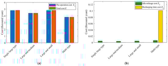 Comparison of the cost among various vehicle schemes under a 3-trip frequency scenario: (a) Comparison of operation cost Z1 and total cost Z and (b) Comparison of idle mileage cost Z2 and recharging time cost Z3.