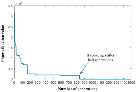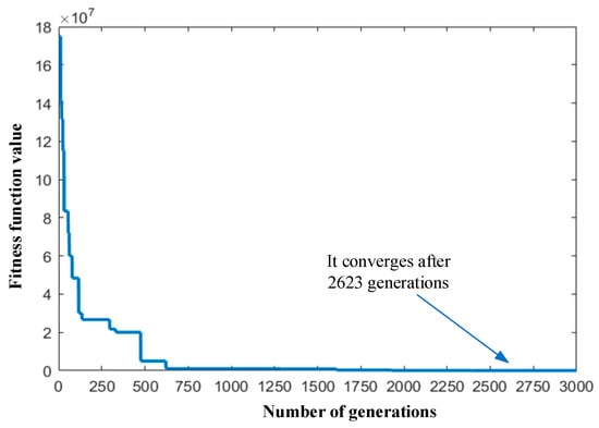 The feasibility of the solution is demonstrated in Figure 9. It shows that the fitness function of the GA converges. The average fitness function value gradually decreases, prior to the 500th generation. The evolutionary progress exhibits a rapid decrease in the early stages, before 500 generations, followed by a slower decline between 500 and 2623 generations. As the generations progress, the fitness values stabilize and eventually approach the optimized value after 2623 generations. This indicates that GA is able to find an optimized solution for the case.
