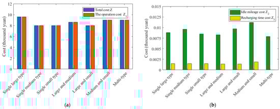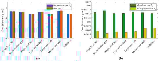 Comparison of the cost among various vehicle schemes under a 2-trip frequency scenario: (a) Comparison of operation cost Z1 and total cost Z and (b) Comparison of idle mileage cost Z2 and recharging time cost Z3.