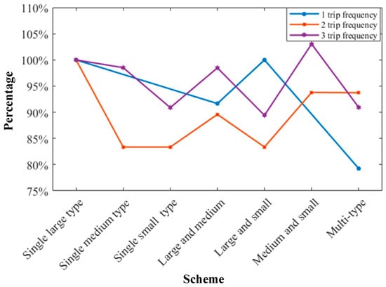 We compared the total cost of each line optimization scheme with the total cost of the 1st scheme (single large-type), as illustrated in Figure 10. The results clearly indicate that the implementation of multi-type vehicles can significantly reduce the costs. In the case of Scenario 1, the two-type vehicle scheme demonstrates an 8.3% reduction in the total cost compared to the 1st scheme (single large-type), while the 7th scheme (multi-type) achieves a remarkable 20.7% reduction. Similarly, for Scenario 2, the total cost of the 7th scheme (multi-type) is 6.2% lower than that of the 1st scheme (single large-type), and the two-type vehicle scheme achieves a 10.6% reduction. As for Scenario 3, the 7th scheme (multi-type) yields a 9.1% cost reduction compared to the 1st scheme (single large-type), and the two-type vehicle scheme reduces the total cost by up to 10.6% compared with the 1st scheme (single large-type). While the 3rd scheme (single small-type) also reduces the total cost in Scenario 2 and 3, it unfortunately leaves a significant number of passengers delayed—32 passengers in Scenario 2 and 54 passengers in Scenario 3. Therefore, the application of multi-type vehicles proves to be a superior solution.