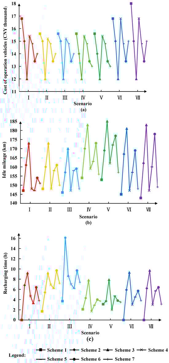 Figure 11 reflects the change curve of the three optimization objectives in the different scenarios. The change trajectories of the objective values of the seven schemes in the seven scenarios are similar. Consequently, Scheme 7 is recommended based on the trade-off between the vehicle operation cost, the idle mileage, and the recharging time. The superiority of multi-type EPTV employments has been proven.