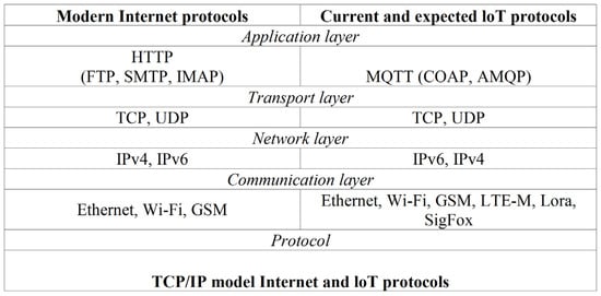 The Internet of Things (IoT) is built on existing network infrastructure, technologies and protocols currently used in homes, offices and the Internet. This means that most IoT runs on existing TCP/IP networks. TCP/IP uses a four-layer model with specific protocols at each layer. The diagram below (Figure 1) shows a comparison of the protocols currently in use and those most likely to be used for IoT [,,] in the future.