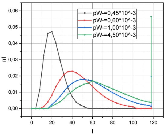 The transport protocol changes the size of the sliding window according to the ratio between the maximum size of the sliding window and the probability of losing a packet of data blocks . It is possible to track three main modes in the dynamics of changing the value of the size of the sliding window. In the first mode, the size of the sliding window quickly reaches its maximum value and keeps it almost all the time during the information transaction. In the second mode, the arrival of a negative service signal leads to a reduction in the size of the sliding window by half with a quick return to the maximum value . In this mode, the corresponding distribution has two extremes at the points and . As the probability of the appearance of a negative service signal increases, the duration of the sliding window size in a stable state (third mode) decreases. The distribution loses its extremum at this point . If the probability of the appearance of a negative service signal exceeds , then the value does not have a noticeable effect on the appearance of the distribution . Breaks of the smooth nature of individual curves from Figure 2 are explained by the chosen mathematical apparatus for describing the studied process which is a priori stepwise.