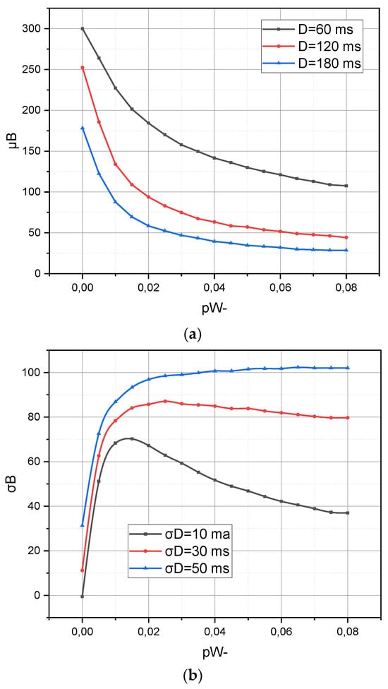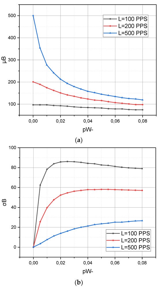 From Figure 3a it can be seen that the curves of the mathematical expectation are monotonic decreasing functions under conditions of the increasing value of the argument . Such a theoretically determined trend coincides with the real behavior of the network construct, which was investigated by the nuttcp utility. It can be seen that the corresponding value of the estimate determines the initial value of the curve and determines the rate of its decreasing with increasing probability . Thus, the accuracy of the estimation of the bandwidth of the communication channel is an important factor that affects the performance of information transfer in conditions of low interference (low probability of the appearance of a negative service signal ). This is an important conclusion because it is a factor that should determine the shift in the focus of attention of researchers from the search for more accurate methods of estimating the bandwidth of a communication channel (low probability ) to searching for more secure methods of encoding data packets or causes of interference (high probability ).