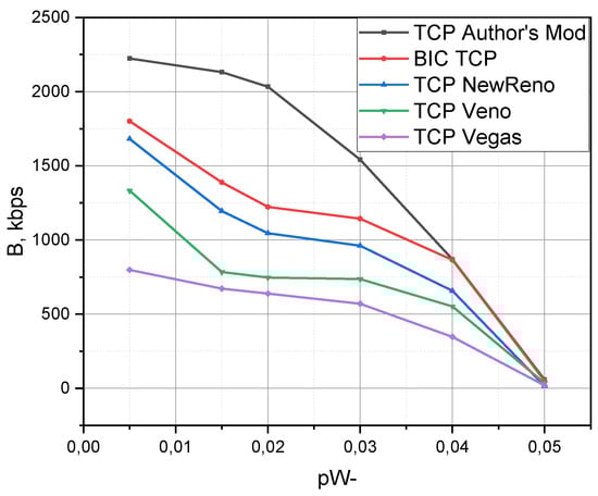 We will conclude the experimental section by comparing the TCP Westwood+ protocol, the Window Scale parameter of which was determined based on the author’s mathematical apparatus, with the BIC TCP, TCP Vegas, TCP NewReno, TCP Veno protocols without tuning (see Figure 5). The communication channel was supported by 5G technology.