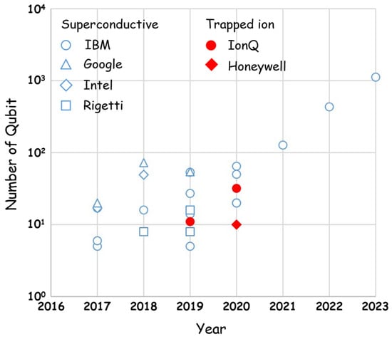 Data and artificial intelligence (AI) are the main drivers of actual information technology. AI algorithms, in their various flavors, are only a side of the equation. The other side is specialized AI chips (e.g., neuromorphic processors), tailored to specific software and business requirements. In this area of AI-oriented microelectronics, quantum processing units (QPUs) are gaining increasing interest. Indeed, they enable the actual execution of quantum algorithms. These algorithms, leveraging the laws of quantum mechanics (QM), pave the way to efficient solutions of mathematical or optimization problems, which, due to their non-deterministic polynomial nature, are not attackable even by the best classical algorithms, because the solution time or the required resources increase exponentially with the problem size []. This is exemplified by the world-famous Shor algorithm for prime number factorization []. Quantum algorithms offer the possibility to speed up calculations that would require a prohibitive amount of time using a classical approach. For instance, the Harrow–Hassidim–Lloyd (HHL) quantum algorithm promises exponential speed-ups in solving linear equation systems []. In 2023, the historical company Rolls-Royce signed agreements with ICT companies to develop quantum algorithms aimed at addressing the notably hard differential fluid dynamic equations crucial for the design of efficient avionic turbojet engines []. Quantum algorithms also hold the potential to speed up AI software technologies like deep learning and machine learning when applied to massive datasets []. It is worth noting that quantum algorithms can be emulated on traditional microprocessors but at the cost of a significant loss of efficiency []. Consequently, major players in the ICT sector, including IBM [,,,,], Honeywell [], Intel [,,,,], Google [,,,], IonQ [,], and Rigetti [], are investing significant efforts in gaining expertise and capabilities to fabricate their own QPU. Figure 1 shows that these endeavors have led to an exponential increase over time in the quantum bits (or qubits), the quantum counterparts of the traditional bits, hosted in a single QPU. The IBM roadmap envisions a QPU with 4158 qubits in the near future and approximately 100,000 qubits in the next decade []. Regardless of the more or less rigorous definition of quantum supremacy, a 100,000-qubit QPU is estimated as a landmark for the addressing of engineering problems of practical relevance.
