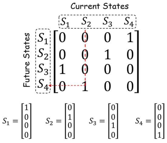 In the simple case of the four-state machine in Figure 2, this bank, and thus, the state of the finite-state machine, can be mathematically represented as a vector. Meanwhile, a matrix, dubbed the transition state matrix, describes how the state evolves over time after the execution of each step in the algorithm. The entries of the matrix can be either 1 or 0. Programming the machine means specifying the entries in the transition state matrix. For each column, the sum of all entries should be 1, ensuring that the machine always has a path to transition from its current state to a future one. For instance, the red dashed line in the figure shows that the current state S2 leads to the future state S4. It is worth remarking that, for a finite-state machine, it is praxis to introduce the terms of current and future states because the microprocessor is a clocked electronics system. In the frame of quantum physics, it is more common to use the terms input and output state.