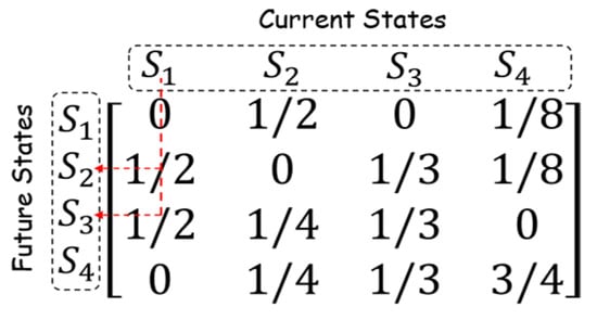 Using the example in Figure 3, the transition probability from the current state S1 to the future states S2 and S3 is 50% with a consolidated probability of 100%. Even when the current state is certain, the future state is not deterministic. The future state vector is therefore a vector of probabilities, with its entries summing to 1, indicating that the future state of the machine is certainly one out of the possible four states.