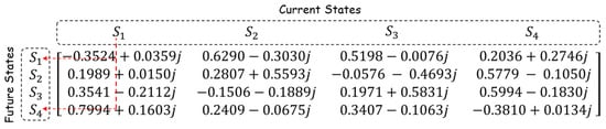 The matrix in Figure 4 describes a quantum microprocessor. As for the matrix in Figure 3, the above constraint guarantees that the microprocessor evolves certainly from the current state to some future state, reachable with a given probability. The probabilities of reaching the future states S1, S2, S3, and S4 from the current state S1 are |−0.3524 + j0.0359|2 ≅ 0.1255, |0.1989 + j0.0150|2 ≅ 0.0398, |0.3541 − j0.2112|2 ≅ 0.1700, and |0.7994 + j0.1603|2 ≅ 0.6647, respectively, with an aggregate probability of 100%. Note that j is the imaginary unit.