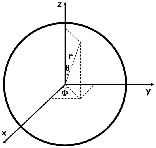 When z(t) = rα(t), x(t) = rβ(t)cos[Φβ(t) − Φα(t)], and y(t) = rβ(t)sin[Φβ(t) − Φα(t)] are defined for Equation (10) and, in the same way, z(t) = rβ(t), x(t) = rα(t)cos[Φα(t) − Φβ(t)], and y(t) = rα(t)sin[Φα(t) − Φβ(t)] are defined for Equation (11), Equations (10) and (11) assume the compact form x(t)2 + y(t)2 + z(t)2 = 1, which describes a unitary sphere in the three-dimensional Cartesian space (x, y, z), dubbed the Bloch sphere. On the other hand, by remembering the relationship of the Cartesian coordinates with the spherical ones in Figure 5 with r = 1, that is, x = sinθcosΦ, y = sinθsinΦ, and z(t) = cosθ, for Equation (10), you obtain the following: