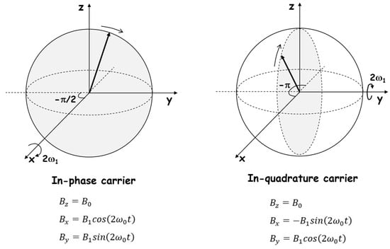 A comparison of Equation (45) with Equations (24) and (25) shows that Equation (25) is the most proper to describe on the Bloch sphere the effect of the rotating magnetic field on |ψ⟩. The state vector of the qubit rotates around the y axis (Φ = −π), as depicted on the right in Figure 6, at an angular speed equal to the Rabi frequency 2ω1.