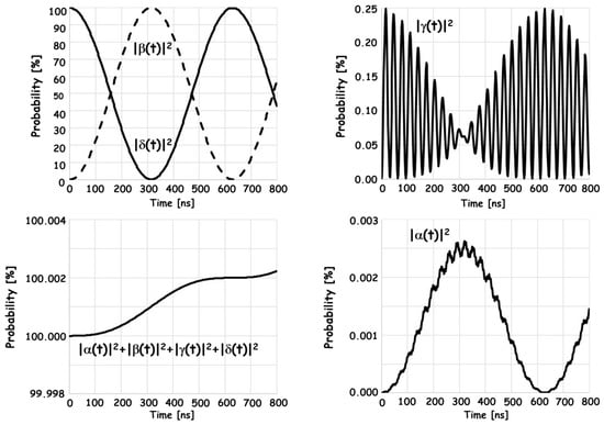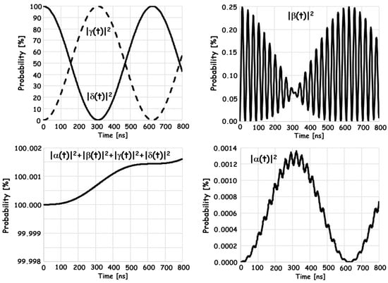 On the other hand, for the initial conditions α(t = 0) = 1 and β(t = 0) = 0, still under the condition ω = 2ω0, the solution of Equation (39) is as follows (see Appendix A):