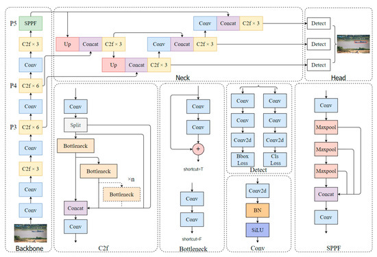 The YOLOv8 model includes these major parts: input, backbone, neck and head (Figure 1). In practical applications, the image is scaled to meet the size requirements of the input. Data enhancement methods such as mosaic and mixup can also be used for this step. The convolutions down-sample the backbone to extract features, and each convolution contains batch normalization and SiLU (sigmoid linear unit) activation functions. YOLOv8 uses the C2f (CSPBottleneck with 2 convolutions) block to further extract features, which references the E-ELAN (extended efficient layer aggregation network) structure of YOLOv7 [41], enriching the model gradient flow with more branching connections that cross layers to improve detection results. The shortcut connection is true when C2f blocks in the backbone, and false when it in the neck. The SPPF (spatial pyramid pooling fast) block serves as the end of the backbone and uses three max-pooling layers to collectively process features at various scales to enhance the network’s capability for feature abstraction. FPN and PAN (path aggregation network) [42] structures are utilized by the neck network to fuse information from feature maps with various sizes and pass them to the head. YOLOv8 uses a decoupled detection header to compute losses separately for regression and categories through two parallel branches of convolutions. Each branch is thus enabled to concentrate on the task of its own. As a result, the model can generate detection results with improved accuracy.