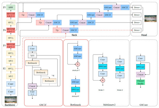 In ship detection and monitoring scenarios, the YOLOv8 algorithm still has problems such as insufficient accuracy and an insufficiently streamlined model. In this paper, the lightest YOLOv8n will be chosen as the original network for improvement. Figure 2 shows the improved network structure. The proposed model replaces the backbone network used for feature extraction with a combination of MobileViTSF and Mobilenetv2 [45]. MobileViTSF is a novel visual transformer structure that we propose based on MobileViT and MobileViTv3. Mobilenetv2 is a classical lightweight backbone structure that uses depthwise separable convolution as a down-sampling module. For the neck network used for feature fusion, we add P2 layers that have greater resolution and, correspondingly, increase the number of detection heads. We use GSConv and depthwise convolution in the bottleneck structure in the c2f block to reduce the computational effort.