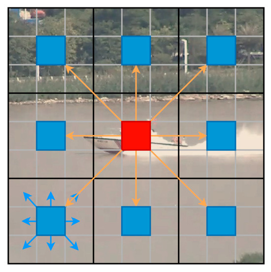Note that for the unfolded feature map , it is generally spread as a sequence, then input into the transformer, and at the time of self-attention, each pixel in the feature map and the other pixels are processed, so that the amount of computation is . In MobileViT, patches are first generated based on a partition of the input feature map, and then the self-attention is calculated only for pixels in the same location of each individual patch, as shown in Figure 4. Here, a patch is represented by a cell surrounded by black lines, while a pixel is represented by a cell surrounded by gray lines. A transformer is utilized to associate the red pixel in the center with blue pixels. Due to the fact that the information of their neighboring pixels has been encoded by blue pixels with convolution, the transformer is able to incorporate the pixel information of all patches in Figure 4. At this time, the amount of computation is reduced to . Since uses convolution to encode localized information from within a 3 × 3 region, and encodes global information for the p-th position of each patch, any pixel included in contains information obtained based on all pixels from .