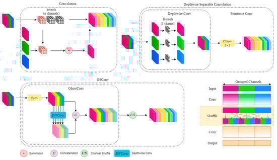 Slim-neck was first applied to vision systems for unmanned vehicles. Its core idea is to keep the excellent and reliable backbone while slimming the neck, which leads to a reduced model size and maintains the detection accuracy. The structure of GSConv in Slim-neck is shown in Figure 5, which incorporates the lightweight idea of GhostNet [47] and ShuffleNetv2 [48]. GhostNet mainly solves the problem that the output of standard convolution usually has many similar feature maps, which can bring redundancy to the computation. Instead of standard convolution, ghost convolution from GhostNet first uses standard convolution to obtain the first part. This part is then convolved via depthwise convolution to get several similar feature maps as the result of the second part. Finally, the two parts are concatenated together as the output feature map. ShuffleNetv2 mainly addresses the fact that the channel information in the depthwise separable convolutional input feature maps is separated during computation, and therefore the information interaction between the channels is separated from each other. Channel shuffle is to shuffle the feature maps along the direction of the channels, using a lower computational cost to make the information between the channels interact with each other.