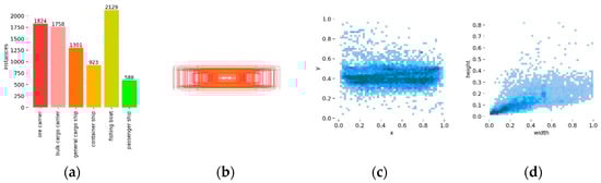 SeaShips dataset details; (a) the instance number for each category in the SeaShips dataset; (b) the size of the GT (ground truth)box for each instance; (c) the coordinates of the midpoint of each GT box; (d) the height and width of each GT box.
