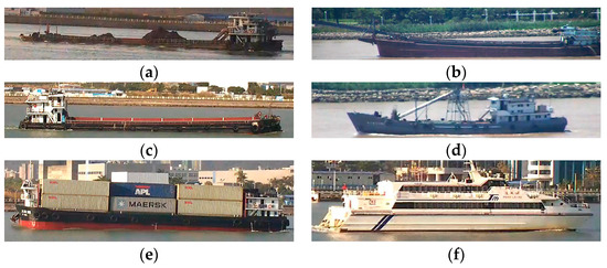 Examples for all categories of ships in the dataset; (a) an example of ore carriers; (b) an example of bulk cargo carriers; (c) an example of general cargo ships;(d) an example of fishing boats; (e) an example of container ships; (f) an example of passenger ships.