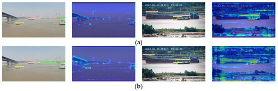 The performance of the proposed model is also compared with that of the YOLOv8n model. Figure 8 shows a comparison of the recognition results for small ship targets where the heat map was generated using Grad-CAM (gradient-weighted class activation mapping) [50]. The original YOLOv8n did not detect ships that were far away from the camera and small ships that appeared between larger ships. As the heat map demonstrates, our method incorporates a large-scale small target detection layer. As a result, higher weights are generated for these small targets after shallow features are fused. These small ship targets can thus be detected using the proposed approach.