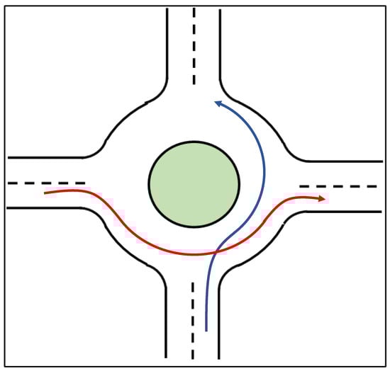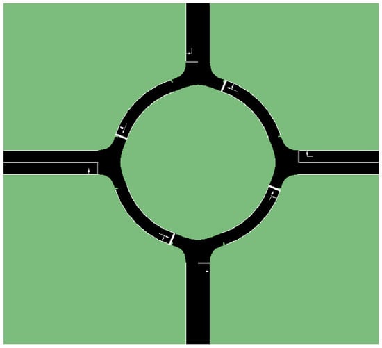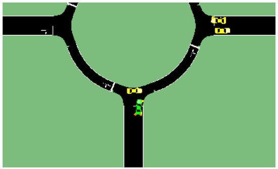 According to [], regular intersections are replaced with round intersections to improve traffic efficiency and safety [], but there are still traffic problems due to merging and diverging operations, which are relatively easier for a human operator compared with an autonomous vehicle due to the difficulty of the decision-making process. Motivated by this, researchers like [] have tried to mimic human decision-making by using imitation learning, for example. Decision trees were used in [] to model human decision-making in handling round intersections. However, handling round intersections is not very easy for human drivers either, according to []. This is due to the difficulty in detecting and tracking the other vehicles in the round intersection due to the round geometry and occlusions of view [,]. The Vehicle-to-Vehicle (V2V) communication to detect and track all vehicles in a round intersection, as proposed in [], will obviously help with this measurement problem, but this requires all vehicles to be equipped with V2V modems, which is not the case currently. Even if all vehicles had V2V communication capability, partial observability of the other vehicles would still result from accuracy problems in localization sensors used and communication problems like latency and packet loss []. According to [], drivers are still not accustomed to round intersections and have problems in the form of unpredictable decisions. Deep reinforcement learning was used in [] to solve this problem, but the training of a deep reinforcement learning control system is very time-consuming and also depends a lot on the intersection geometry used.