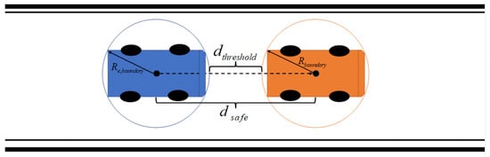 which is the distance between the center of mass of the agent vehicle (ego vehicle) and that of the nearest vehicle of detection. is determined by the dimensions of the vehicles and the speed limit of the road. As illustrated in Figure 4 below, to determine the safety bound of vehicles, a circular range around each vehicle is considered such that the boundary will not be influenced by the heading direction of vehicles. Therefore, the safety threshold distance is a summary of the threshold distance as well as the two radii of the circular boundaries generated from the vehicles’ dimensions and is given by