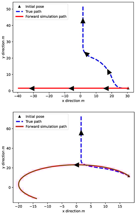 In a decision-making cycle, the planning starts from some initial state sampled from the belief state space at current time, denoted as , and carries out a forward simulation to generate potential trajectories of the states for optimizing the expected cumulative reward along the optimization horizon , with being the decision-making horizon. Directly implementing the vehicle motion models in Equation (10), even with the knowledge of the yaw rate at , the true trajectory deviates a lot from the simulated trajectory that tracks the potential vehicle trajectory on the optimization horizon. The model alone is not enough to describe the vehicle state transitions under the round intersection traffic scenarios, as shown in Figure 6. In Figure 6, the true trajectories are not successfully tracked by directly implementing the state transition equations from the initial state. The forward simulation path is calculated for 100 steps, and the arrows show the direction of the vehicle moving or the direction of the simulation. This will cause a lot of issues when making decisions for the ego vehicle to pass the round intersection safely and efficiently. This issue will also affect the solution of the POMDP problem based on the Monte-Carlo Tree search since the Monte-Carlo simulation for the state particles is the core procedure in the tree search algorithm.