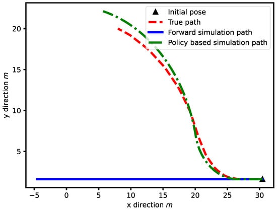 To illustrate the difference in utilizing this method, a forward simulation trajectory is generated with the policy-based state transition model, as shown Figure 7. From Figure 7, we can see that the policy-based simulated path is very similar to the true path of a vehicle passing a round intersection, where only the initial state is given. In the simulated path generation, we assume that the policy of entering the round intersection is given such that the vehicle yaw rate is generated based on the policy, so the vehicle is turning in a clockwise direction to enter the round intersection instead of keeping the original heading angles and yaw rate from the straight lane. In this case, the decision made by the agent vehicle will be closer to the real situation and improve the performance of the decision-making algorithm.