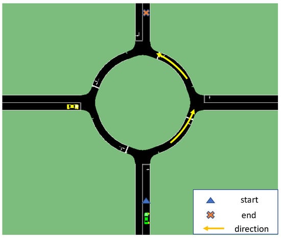The simulation results compare the performance of the decision-making algorithm with decision-making using the OOPOMDP with and without a policy-based state transition against the benchmarking system of the SUMO simulation system built-in vehicle model, which is an Intelligent Driver Model (IDM) that executes lane following. The results compare the total travel time, total reward and if there is an emergency brake acted by other vehicles in the system. First, a two-vehicle scenario simulation is performed, and the results are presented below. The diagram of the two-vehicle scenario is presented in Figure 9. The autonomous vehicle, colored green, traverses the round intersection starting from the bottom and tries to reach the destination points at the top in the figure. The simulation results for this two-vehicle scenario are summarized in Table 1.
