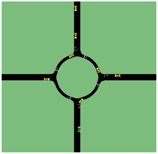 A microscopic traffic model considers individual vehicles with car following, traffic rule obeying and lane changing models within a mathematical model of the road network under analysis. There are many microscopic traffic simulation tools like Vissim, SimTraffic, AIMSUN, CUBE Dynasim, SUMO and others, according to [], where the commercially available tool Vissim was used for round intersection analysis. A microscopic traffic simulator was used to evaluate the traffic flow capacity of a round intersection in []. SUMO was used in [] for a gap acceptance analysis for round intersections. SUMO was also used in [] for centralized intersection management at an intersection, curvilinear decision-making for a two-lane round intersection in [] and cooperative perception analysis in a round intersection in []. In accordance with these references, SUMO is used for microscopic traffic simulation in the two-vehicle and multiple-vehicle simulations of this paper. It is also widely used by many researchers and is freely available.