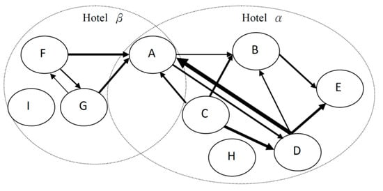In online traveling communities, users can browse, comment, and post their reviews to share with each other. By definition, such a social relationship can form a social network. For example, in Figure 1, there is a directed social network for two hotels α and β. Every node refers to a reviewer who posted a review or commented certain review. An example of a directed link, from node A to node C, shows that user A posted a review, and then user C commented on the review of user A. Regarding the no-response nodes, i.e., H and I, the status indicates that they posted reviews, but other users did not comment on their reviews. Regarding the width of the directed link, if it is wider, the two nodes are more similar. For example, the sentiment of the link D-to-A is wider than that of C-to-A, so the two nodes D and A are more similar. By using the technology of social networks, we can analyze the properties of nodes and links to obtain the trustworthiness of reviews and reviewers in online travel communities.