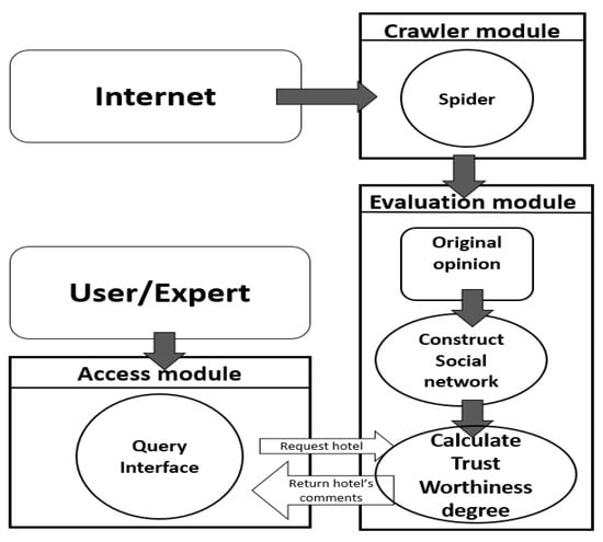 In this study, we first constructed a social network with respect to the commented hotels, their associated commenters, and the followers of the comments. Through the segmentation of the social network, we evaluated reviews residing in an ego-centric social network rooted in a specific hotel. Three ideas, namely, the similarity of the reviewer’s sentiments about the social network, the reviewer’s behavior, and the semantic features of the reviews, are formulated as a final mathematical formula. The experimental study justifies the proposed approach to evaluating reviews, indicating the reliability of the authors’ approach. Three modules, shown in Figure 2, are used to implement the proposed method. The first module is the crawler module, which is equipped with a spider to collect the comments for the hotels from specific travel websites. The collected comments and the links embedded in the comments for hotels are used as the data to construct the ego-centric social networks rooted in each hotel. A pair of reviewers residing in the same ego-centric network can have a directed link between them if one’s comment is re-commented by the other. For example, reviewer D has a direct link to reviewer A if reviewer D re-comments the comment issued by reviewer A about the same hotel. The last part of the second model is to use the proposed mathematical formula (discussed later) to evaluate the trustworthiness degree of each collected comment. The three ideas mentioned above are used to calculate the final score of each comment. The last module is an interaction interface to reply to the ranked comments of the user for a queried hotel.