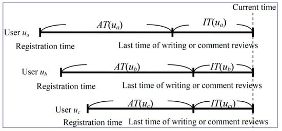 The study [40] states that spammers usually post a lot of review spam in communities in a short time after they just registered. In addition, spammers seldom return to these websites again. As a result, the contribution degree, shown in Equation (16), needs to be degraded according to the passing time. We adopt the time gap (called idle time) to evaluate the decline of the contribution degree, where idle time refers to the time that a review appeared until now. If the value of idle time is long, the contribution degree is low. On the other hand, the registration time is another important factor for the contribution degree. In general, normal reviewers share reviews or comments continuously after they register in the online community. Thus, we evaluate the contribution degree of reviewers by using the period from their registration to their latest activity, which is called active time. The contribution degree is high if the value of active time is large.