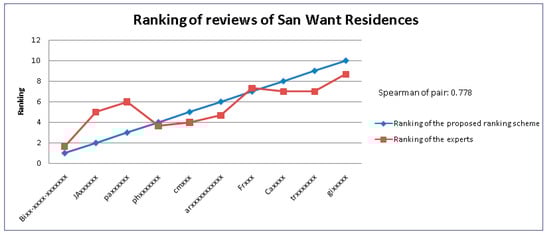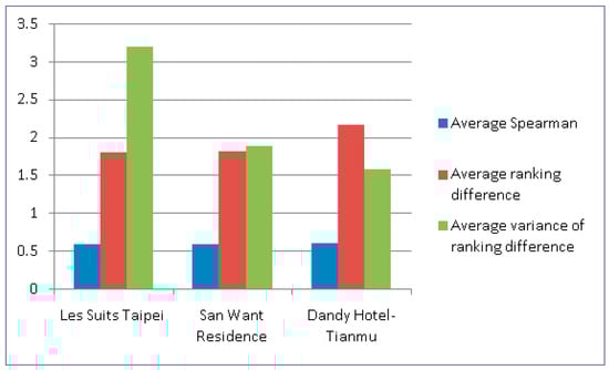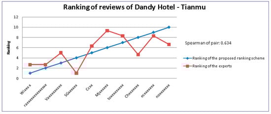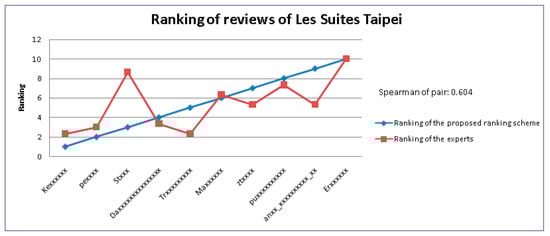 In order to demonstrate the effectiveness of our method, we compared the results of our method with those of the experts’ judgments. Specifically, we adopted Spearman’s rank correlation coefficient [41] (abbreviated as SRCC) to evaluate the similarity of the ranking results. The values of Spearman’s rank correlation coefficient range from −1 to 1. A value of 1 indicates that the two objects have the largest positive correlation; while a value of −1 means that the two objects have the largest negative correlation. In Figure 4, the value of the SRCC is 0.778 in the review ranking of Les Suites Taipei, which means a highly positive correlation between the results of the experts and our method. Figure 5 and Figure 6 show that the values of the SRCC are 0.604 and 0.634 in the review ranking of the San Want Residences and Dandy Hotel-Tianmu, respectively, which indicates a moderately positive correlation between the results of experts and our method. In sum, the experimental results show that the evaluation of our method is closely correlated to that of the experts.