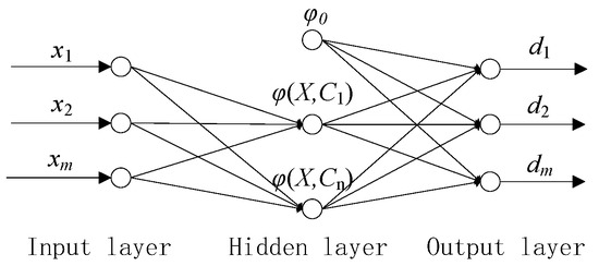 When using a generalized RBF neural network structure, the learning algorithm of the RBF neural network should address issues such as how to determine the number of hidden layer nodes in the network, how to determine the data centers and extension constants of each radial basis function, and how to correct the output weights. The topology structure of the RBF neural network is shown in Figure 2 [23].