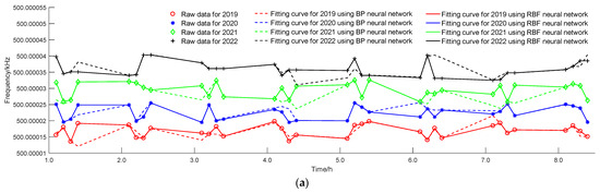 To verify the effectiveness of the proposed theory, an RBF neural network model was constructed using MATLAB (https://www.mathworks.com). Modeling can be divided into time-driven models and data-driven models based on the different prediction objectives and input data. The input data of the time-driven model is time and collection frequency, and the output is corresponding measurement data, which can predict the stability and accuracy of the measurement data of the same type of device in the training sample within the year. The data-driven model inputs measurement data for a certain year and outputs measurement data for the corresponding next year, which can predict the stability and accuracy of the measurement data device for the next year.