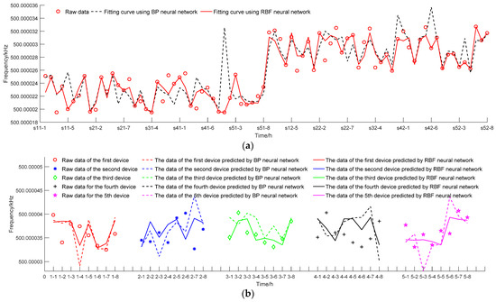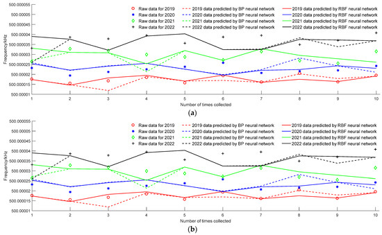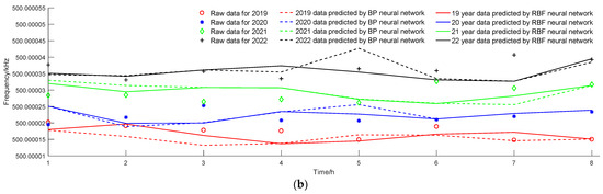 Using a time-driven model and using data from four devices as training samples, the stability fitting curves for the years 2019 to 2022 were obtained, as shown in Figure 4a. Figure 4b shows the comparison between the actual measurement results and predicted results of the fifth device from 2019 to 2022 under stability measurement conditions. The stability of the corresponding year calculated is shown in Table 2. The simulation results show that the predicted results are basically consistent with the measured values. Among them, the RBF neural network has a better-fitting performance compared to the BP neural network, and the predicted stability is closer to the actual value.