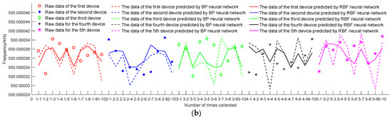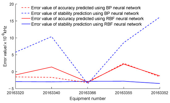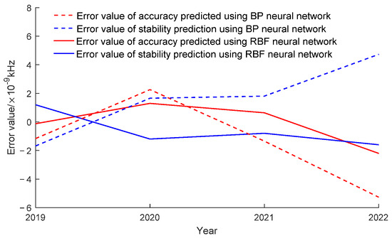 From Figure 8 and Figure 9, it can be seen that both the time-driven model and the data-driven model have predicted data errors of stability and accuracy on the order of 10−9. The mean squared deviations of stability and accuracy prediction errors for RBF neural networks driven by time are 1.077 × 10−9 and 1.729 × 10−10, respectively. The mean squared deviations of stability and accuracy prediction errors for BP neural networks driven by time are 2.269 × 10−9 and 2.666 × 10−9, respectively. The mean squared deviations of stability and accuracy prediction errors for RBF neural networks driven by data are 0.650 × 10−10 and 2.077 × 10−9, respectively. The mean squared deviations of stability and accuracy prediction errors for BP neural networks driven by data are 5.374 × 10−9 and 2.112 × 10−9, respectively. From the data, it can be seen that the mean square deviation of stability and accuracy prediction errors for RBF and BP neural networks is much smaller than the uncertainty of system calibration. The predicted results meet the requirements. The prediction error and mean square error of an RBF neural network are both smaller than those of a BP neural network. Therefore, in the prediction method of clock tester calibration data, an RBF neural network is superior to a BP neural network. The mean square error of the time-driven model prediction data is smaller than that of the data-driven model prediction data. Therefore, when predicting the stability and accuracy of equipment, when there are measurement data of other devices of the same model in the prediction year, a time-driven model can be selected. When there are no predicted annual data, a data-driven model can be selected.