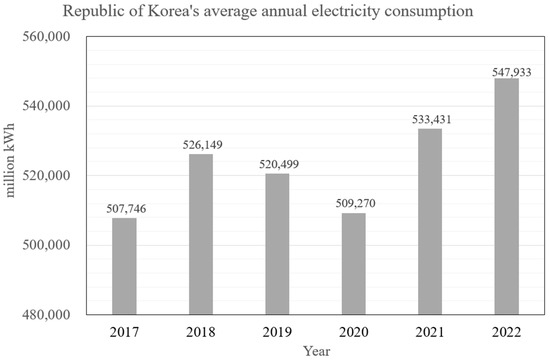 During the coronavirus 2019 (COVID-19) pandemic, electric energy usage decreased worldwide but now appears to be on the rise again [10]. According to data from the Korea Electric Power Corporation (KEPCO), as shown in Figure 1, South Korea’s electricity usage increased by 4.74%, from 509,270 million kWh in 2020 to 533,431 million kWh in 2021, and then by 2.72% to 547,933 million kWh in 2022. This annual average electricity usage growth rate significantly surpasses that from 2017 to 2022 (1.57%). The increased electricity usage since the COVID-19 pandemic is primarily due to coal-fired power plants, which emit a substantial amount of carbon, as opposed to carbon-neutral alternative energy sources. Thus, efforts to reduce the use of electrical energy by increasing alternative energy production are urgently needed.