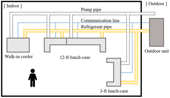 Here, we assumed that the indoor unit is installed with an expansion valve through which the refrigerant flows in and performs the function of internal storage, while the outdoor unit releases the latent heat of the refrigerant through the process of evaporation–compression–condensation. Commercial refrigeration systems often have large capacities or consist of multiple built-in systems; as such, they are installed with separate indoor and outdoor units.