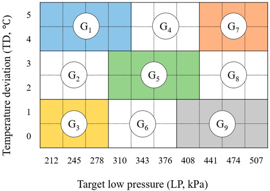 The proposed energy efficiency improvement algorithm divides the operation of the inverter-type outdoor unit into search and operation sections and changes the set temperature difference and target low pressure in the search section to determine the values that achieve the highest performance. Once the set temperature difference and target low pressure are determined, the inverter-type outdoor unit operates at that value during the operation section. Based on expert consultation with commercial refrigeration system manufacturers, the temperature, as shown in Figure 4, is divided into six levels (0–5 °C), and the target pressure is divided into 10 levels (spanning 212–507 kPa). In our proposed approach, the Monte Carlo method was employed, effectively dividing the process into nine segments to reduce the computational workload.