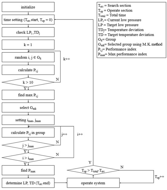 Figure 5 shows the heuristic energy efficiency improvement algorithm for a commercial refrigeration system without indoor unit information. First, the search section (Tsrc) and operation section (Top) of the inverter-type outdoor unit are set to 0, and the set temperature difference (TDj) and current low pressure (LPi) are checked. The most important factors for an inverter-type outdoor unit without information from the indoor unit to operate energy efficiently are the set temperature difference (TDj) and current low pressure (LPi). The set temperature difference is an arbitrary value between 0 and 5 °C. The target low pressure is set to 1 of 10 values measured from an inverter-type outdoor unit. The target low-pressure stage is a requirement of the company that supported the research service and is the stage at which the inverter-type outdoor unit normally operates. The Monte Carlo method is then used to calculate the performance index value (Pi,j) of any coordinate of the first to ninth groups (Gk). The reason for selecting the nine random groups was also determined by the requirements of the companies to which they applied. The group with the highest performance index value (Pmax) is selected. Here, the performance index can be calculated as follows: