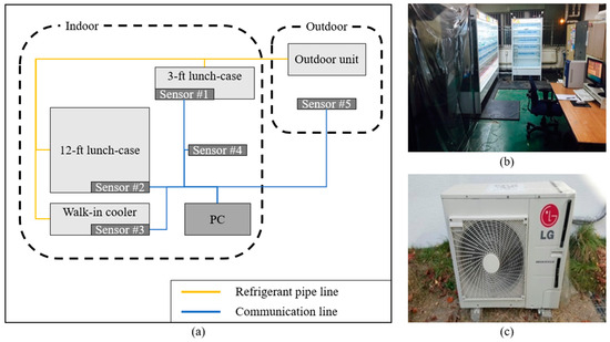 Commercial refrigeration system experimental test-bed structure. (a) Schematic diagram of the entire commercial refrigeration system. (b) Experimental environment for indoor unit (3 ft lunch case, 12 ft lunch case, walk-in cooler). (c) Experimental environment for outdoor unit (5 HP LSC-V0990A9).