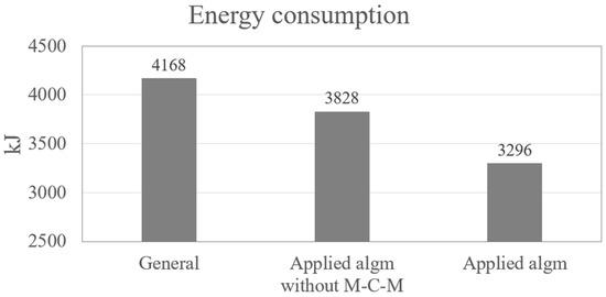 Figure 7 shows the performance evaluation results of the proposed heuristic energy efficiency improvement algorithm. In the absence of information about the indoor unit, it was confirmed that the inverter-type outdoor unit operated 24 h a day in a random manner set by the manufacturer, with an average energy consumption of 4168 KJ per hour. It was also confirmed that the inverter-type outdoor unit to which the proposed algorithm was applied in the absence of indoor unit information operated 24 h a day according to the algorithm and consumed an average of 3296 KJ per hour. Furthermore, the inverter-type outdoor unit to which the proposed algorithm was applied exhibited reduced power consumption (by 26.5%) compared to the inverter-type outdoor unit that normally operated without indoor unit information. This is because the inverter-type outdoor unit to which the proposed algorithm is applied finds the optimal set temperature difference and target low pressure through the search period. This occurs even without indoor unit information; thus, power consumption is lower than that of a general inverter-type outdoor unit. On the one hand, an inverter-type outdoor unit without indoor information to which the algorithm is not applied cannot know the set temperature difference and target low pressure, so it operates at the time set to operate by the user and stops at the time set to stop. In this inverter-type outdoor unit driving method, energy efficiency is determined by user operation, and energy efficiency may vary greatly depending on the user. On the other hand, the inverter-type outdoor unit to which the algorithm proposed in this paper is applied has little variation in energy efficiency depending on the user, and power consumption will be reduced due to improved energy efficiency.