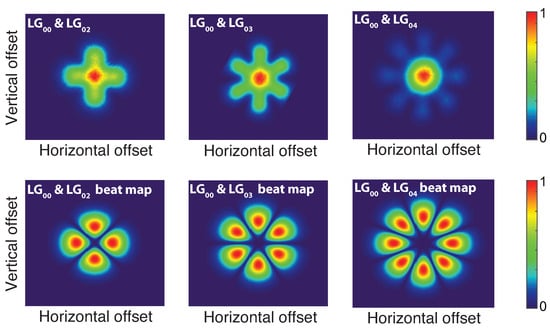 Among the possible coherent optical sources that could be used to generate the optical beating, we recently proposed using a continuous-wave, high-power, highly-coherent, tunable, dual-frequency laser. This laser is based on III-V semiconductor vertical external-cavity surface-emitting laser (VeCSEL) technology, simultaneously emitting two transverse modes operating around 1064 nm [] in a single linear polarization state. We demonstrated coherent and tunable THz emission using two types of photomixers: a commercial uni-traveling carrier photodiode [] and a plasmonics-based photoconductive antenna []. In these reported experiments, the two laser fields are intracavity, low-divergence Laguerre–Gauss (LG) modes emitting at two distinct frequencies, thus allowing for THz generation at the beat frequency through the excitation of a photomixer thanks to its non-linear response. One of the two modes is the fundamental Gaussian mode LG, while the other is a higher-order LG mode that presents zero intensity in the centre (x is the azimuthal quantum number) and an azimuthal standing wave exhibiting phase shift between successive lobes. The overlap between these transverse modes is small enough to ensure stable dual-frequency operation within the homogeneous-gain laser and is sufficient to couple significant and balanced optical power at the two frequencies. The intensity map of the calculated beat intensity is represented in Figure 1 to illustrate the available beat spots in the transverse plane at the laser output. At each transverse position, the beat intensity is the square root of the product of the intensities of the two modes. We should note that alternating electronic excitation could only be obtained at the position revealed by this beat map; no beat signal could be obtained along the optical axis. The coupling of the beat signal could be realized using a single-mode fibre placed at one of the beat map maxima, as described in [,], but this approach is limiting as only one beat spot among the available ones is collected by the fibre; this reduces the available THz power by a factor of , as the THz power typically scales with the square of the incoming optical power.