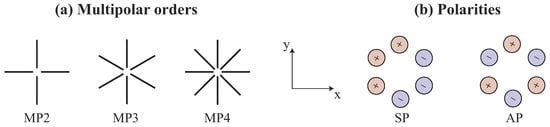 We designed multipolar antennas at 100 GHz as a proof-of-concept, with the objective of matching the specific dual-frequency E-field optical excitation that is spatially structured in both phase and amplitude. Crossed dipoles were considered, as shown in Figure 2a, consisting of 2 to 4 dipole antennas, referenced as MP2, MP3, and MP4. These could respectively be excited by LG/LG, LG/LG, and LG/LG transverse-mode pairs of the dual-frequency laser. These dipoles are placed in the (x,y) plan; therefore, the antenna is geometrically oriented in the z-direction. The gap between the arms (empty inner disk diameter) is about 80 m, and the arm width is 40 m for the MP2 and MP3 geometries, scaling down to 20 m for the MP4 to avoid overlap between arms close to the centre of the antenna. A key parameter for these antennas is the polarity of their excitation. We will study two types of polarity distribution, as shown in Figure 2b for the MP3 antenna: the super-dipole polarity (SP), which assigns a specific polarity to one half of the multipolar antenna and the opposite polarity to the other half, and the alternate polarity (AP), where the polarity alternates between neighbouring arms. The former polarity leads to a dipole-like far-field emission diagram, while the latter corresponds to the phase distribution of the high-order LG Laguerre–Gauss transverse mode of the dual-frequency laser. The inner phase of this distribution is inverted ( shifted) between neighboured lobes, leading to a phase at the origin for the beat signal that alternates between 0 and due to the LG/LG superposition.